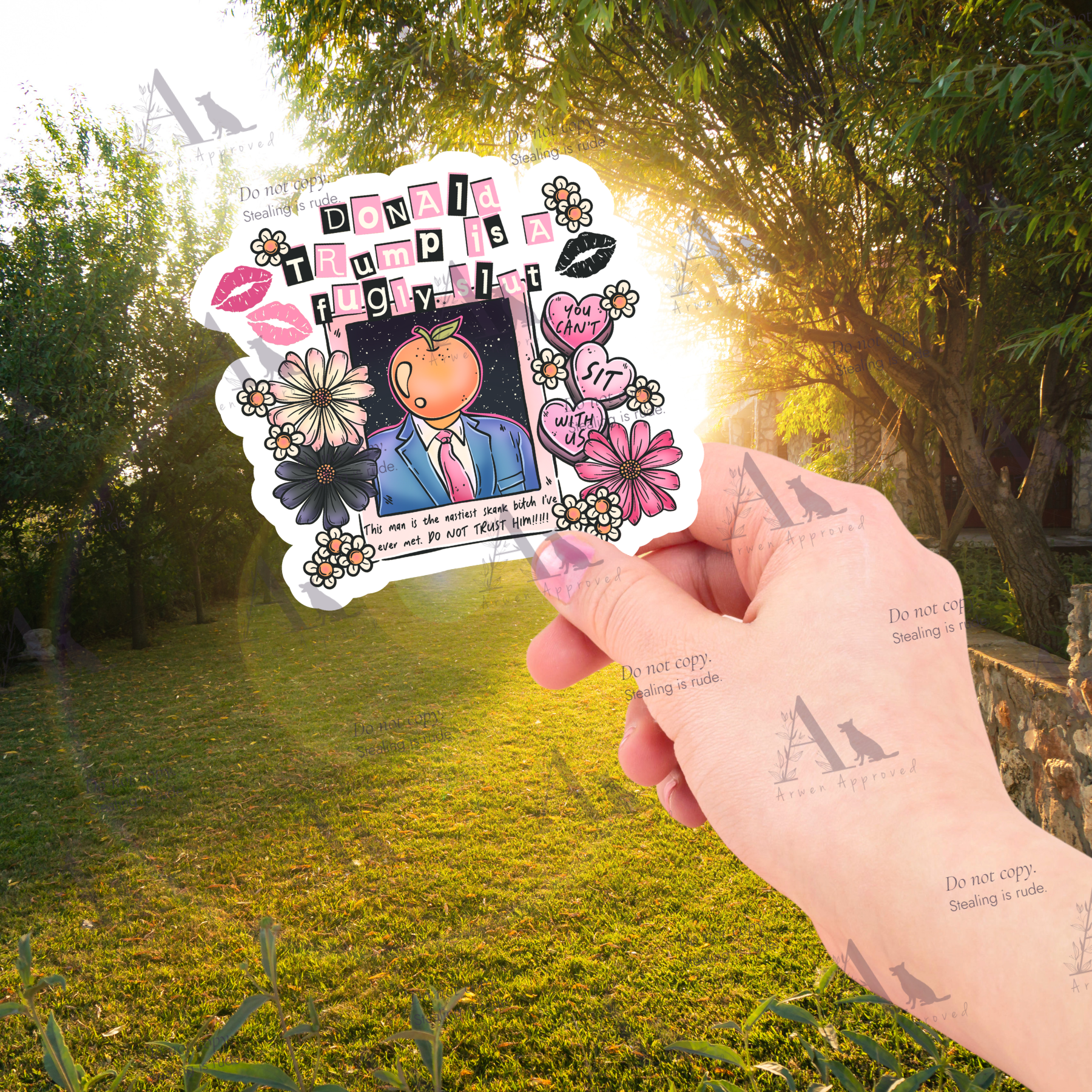 Are you a fan of the Lindsey Lohan movie from the early 2000's? This sticker is a burn book inspired image of DJT with some snarky language. Perfect for showing your values.